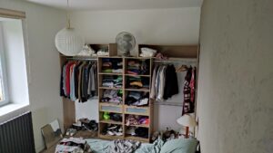 Un projet pour une chambre ce coup-ci, il s’agit de la rectification d’un dressing puis de la fabrication et pose d’une façade toute hauteur. Le dressing d’origine était en mélaminé chêne mais avait été assez mal réalisé. les assemblages étaient approximatifs, les éléments ne jointaient pas bien et les portées des tablettes étaient si grandes que ces dernières cintraient sous leur propre poids.